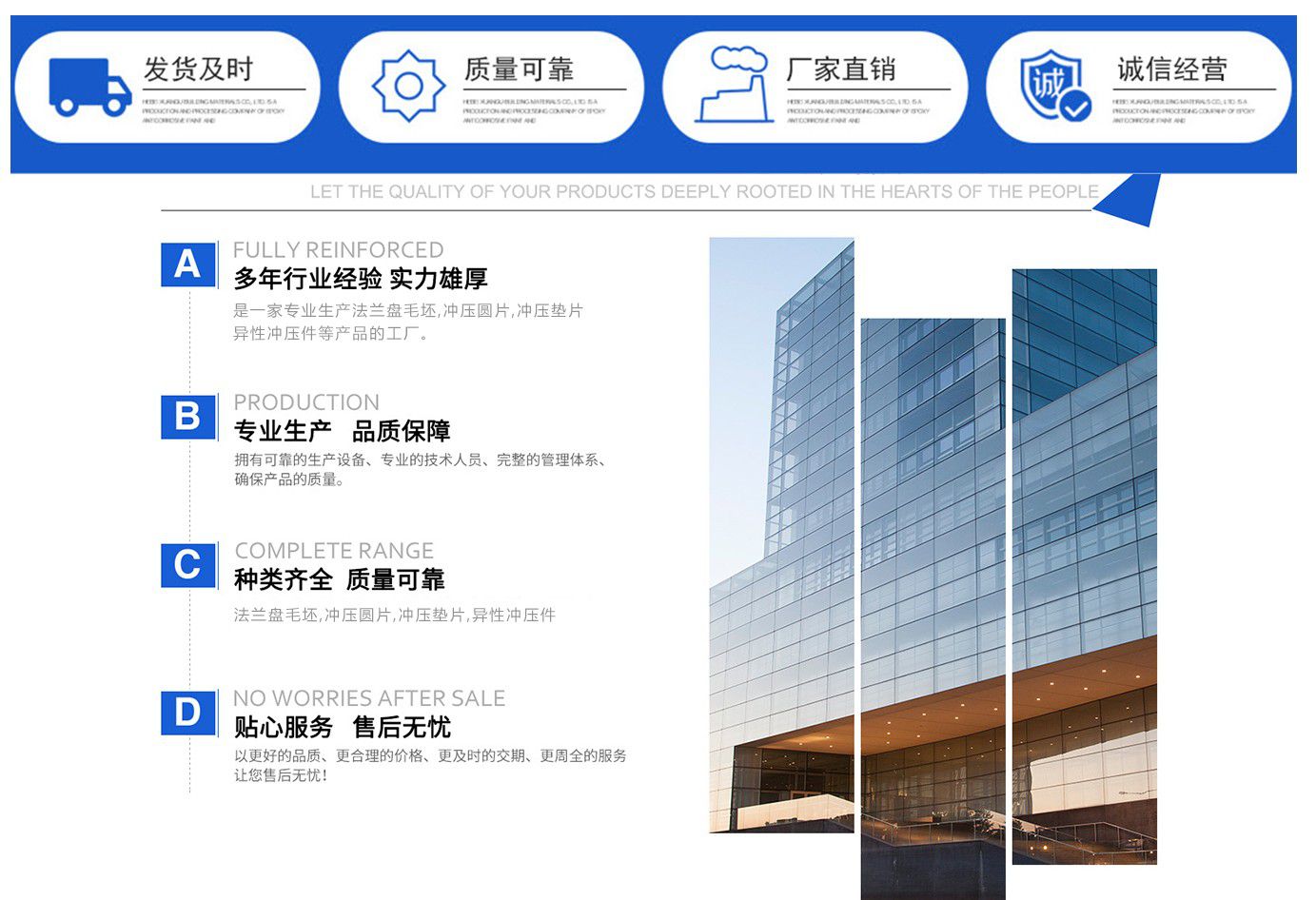 山東恒駿金屬制品有限公司是一家集生產(chǎn)法蘭盤毛坯,法蘭毛坯廠家,沖壓圓片,沖壓墊片,異性沖壓件生產(chǎn)廠家等產(chǎn)品,可根據(jù)客戶需要訂做各種法蘭盤毛坯。 多年來,以科學的生產(chǎn)工藝、嚴格的質(zhì)量管理、先進的服務理念、合理的銷售價格,在國內(nèi)外廣大用戶中贏得了良好的聲譽。 我公司成立迄今,正是由于各界朋友們對于我們的持續(xù)支持與關懷,及本公司全體同仁辛勤的耕耘與付出,使公司持續(xù)發(fā)展與茁壯成長。展望未來,我公司人懷著感恩之心,更加追求卓越的業(yè)績,來回饋社會,服務顧客。 我公司誠摯的希望與新老客戶在互惠互利、友好合作的基礎上,建立良好的貿(mào)易關系,歡迎各單位來人來函到我企業(yè)指導工作,我們有著一支優(yōu)秀的員工團隊,我們堅信企業(yè)的競爭、產(chǎn)品的競爭、技術的競爭,歸根到底是人才的競爭,只有具備了高素質(zhì)的員工才能形成高素質(zhì)的企業(yè),才能掌握市場競爭的主動權(quán)。 我公司理念:“誠實守信,雙贏有泰”,我們對待每位戶都遵循行業(yè)誠信,不虛報產(chǎn)品價格,客戶下訂單后我們抓緊生產(chǎn),保證工期,我們愿與新老客戶本著精誠合作、互惠互利的原則建立廣泛的合作關系,相信通過我們的共同努力定能共創(chuàng)美好未來! 公司宗旨:信譽第一,誠信為本。 公司精神:創(chuàng)新是永恒的主題,超越是不懈的追求。 公司經(jīng)營理念:以客戶為中心,質(zhì)量為根本,信譽為生命。 公...